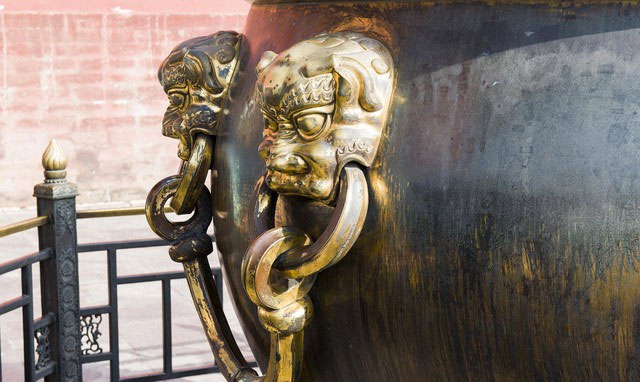 Không chỉ có cặp sư tử đá trấn tọa hai bên, trước Thái Hòa điện còn có 2 chiếc lu đồng cực lớn. Vì sao lại đặt lu đồng sơn vàng trước cung điện như vậy?